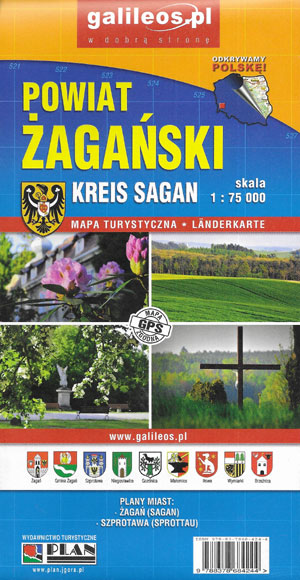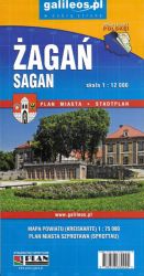 Mapa turystyczna "Powiat Żagański, Żagań" w skali 1:75 000. Wydawnictwo Turystyczne PLAN, Jelenia Góra 2018, wydanie III. Skala 1:75 000, plan Żagania w skali 1:12 000