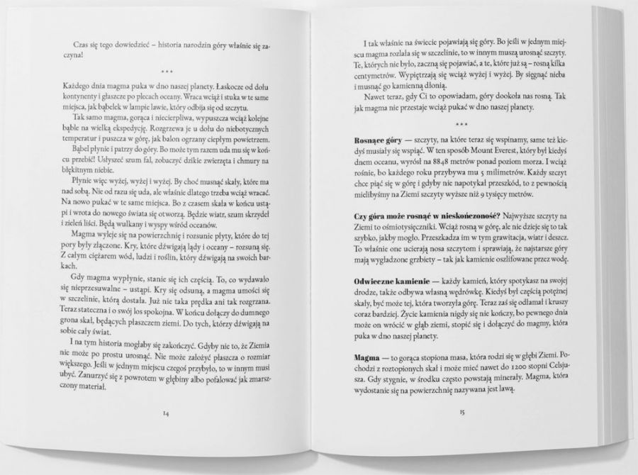 40 gawęd przyrodniczych, które przybliżą dzieciom i ich rodzicom fascynujący świat gór. Jak powstały skały, po których stąpamy, co kryją w sobie minerały, jakie zwyczaje mają mieszkające w górach zwierzęta, jak rośliny radzą sobie w tak trudnych warunkach. Autorka zabiera nas do jaskiń i przeprowadza przez górskie potoki. Zachęca do wędrówek latem i zimą.