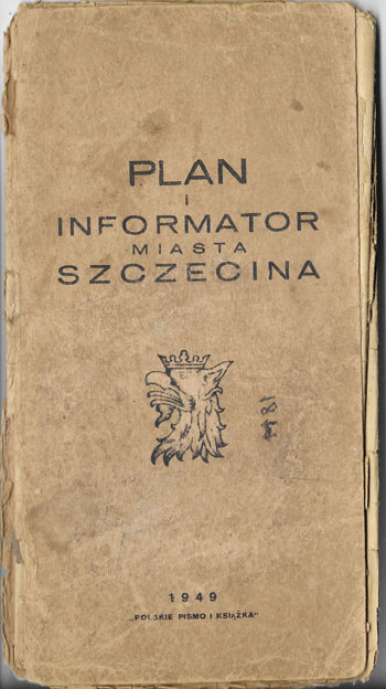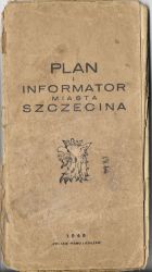 „Plan i informator miasta Szczecina”. Polskie pismo i książka, 1949. Okłądka miękka, podniszczona. Format 11 x 21 cm.