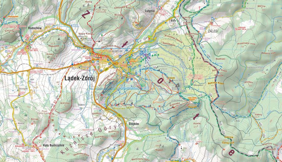 Góry Złote - mapa turystyczna laminowana w skali 1:35'000. Mapa zasięgiem obejmuje jedno z najdłuższych pasm górskich w środkowej części Sudetów Wschodnich ciągnące się szerokim łukiem długości ok. 40 km od Przeł. Kłodzkiej (489 m n.p.m.) na północnym zachodzie do Przeł. U Trzech Granic (1 111 m n.p.m.) na południowym wschodzie. Nazwa pasma nawiązuje do złota wydobywanego przed wiekami w tych górach. Grzbietem Gór Złotych na długości ok. 32 km wiedzie granica państwowa. Po czeskiej stronie góry przyjmują nazwę Rychlebskich hor (od ruin zamku Rychleby).