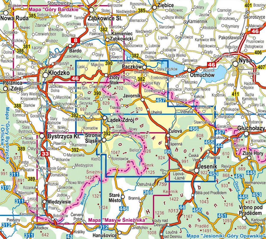 Zasięg mapy wyznaczają: Złoty Stok i Paczków na północy, Trzebieszowice na zachodzie, Jesenik na południu i Sławnowice na wschodzie.