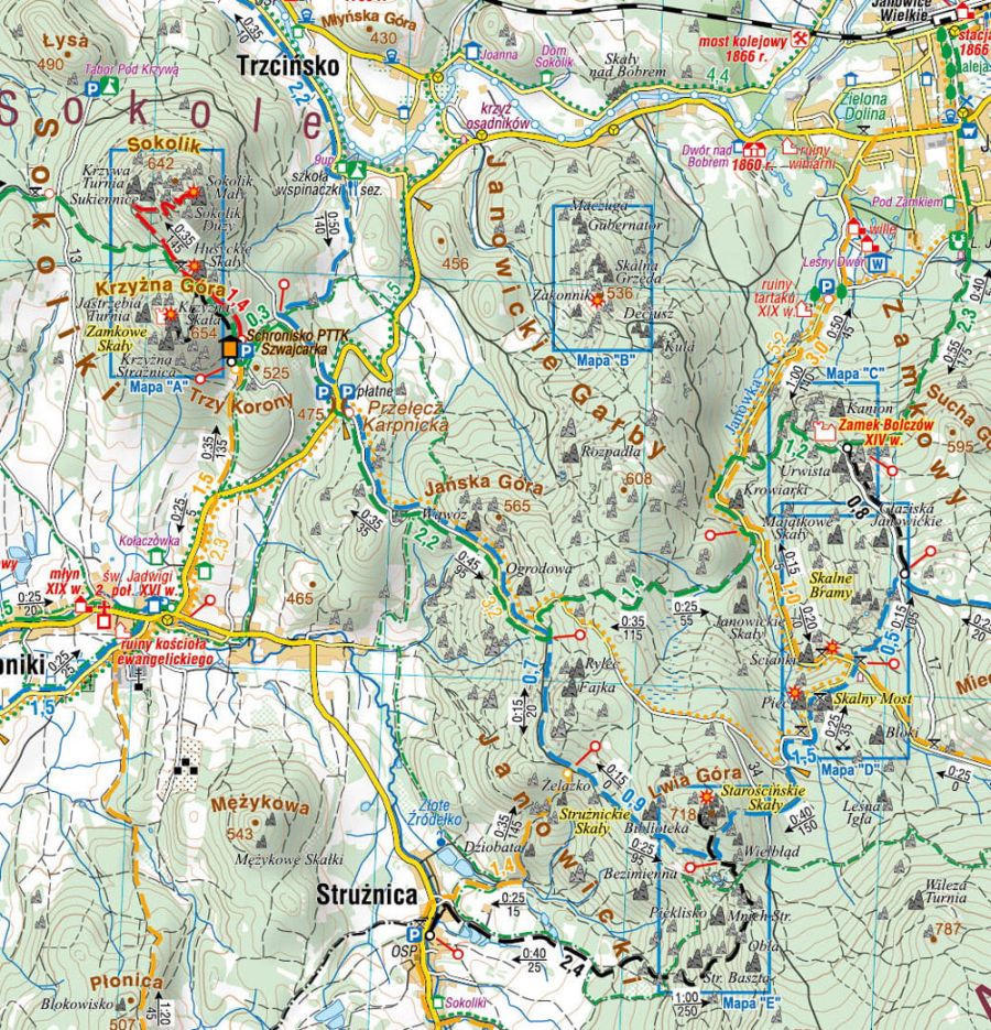 Na osobną uwagę zasługują przedstawione na mapie rejony wspinaczkowe. Dla lepszego podglądu zaprezentowano je dodatkowo w dużej skali 1:10'000. Umożliwiło to bardziej dokładną prezentację lokalizacji skał oraz dodanie ich nazw.
