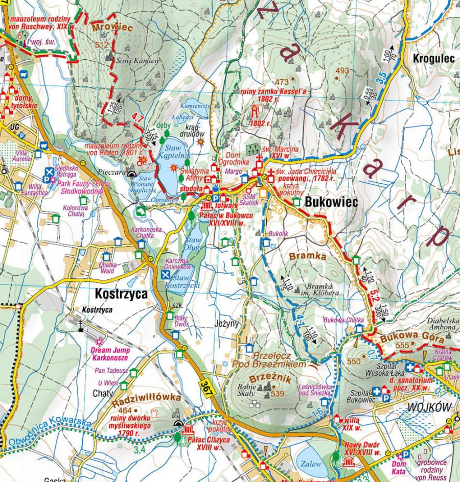 Rudawy Janowickie - mapa turystyczna w skali 1:35'000 z informatorem na odwrocie. Przedstawia niewielkie, ale jakże urokliwe pasmo górskie we wschodniej części Sudetów Zachodnich. Mapa główna sięga po Jelenią Górę na północy, Karpacz i Kamienną Górę na południu. Na zachodzie zasięg wyznaczają Sosnówka i Staniszów, a na wschodzie Marciszów. Dodatkowo publikacja zawiera mapy okolic Cieplic-Zdroju i Dolinę Bobru oraz plany centrum Cieplic-Zdroju i Jeleniej Góry.