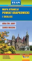 Mapa powiatu krapkowickiego z zaznaczonymi szlakami pieszymi i rowerowymi. Na odwrocie szczegółowe plany miejscowości: Zdzieszowice, Góra Świętej Anny, Krapkowice, Gogolin oraz powiększone centrum Krapkowic, a także opisy miejscowości powiatu i atrakcji takich jak Bory Niemodlińskie, Góra Świętej Anny, Grzbiet Chełmu, Jezioro Srebrne, Lasu Łęgowego koło Zdzieszowic.