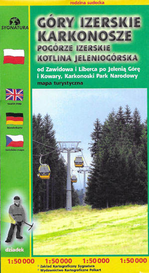 Mapa obejmuje obszar od Zawidowa i Liberca po Jelenią Górę i Kowary. Karkonoski Park Narodowy. Mapa zawiera m.in. czasy przejść, szlaki piesze, rowerowe, konne i narciarskie. Nazwy przystanków, skarby przyrodnicze i historyczne, schroniska. Atutem jest plastyczne cieniowanie rzeźby terenu. Mapa z serii Rodzina sudecka.