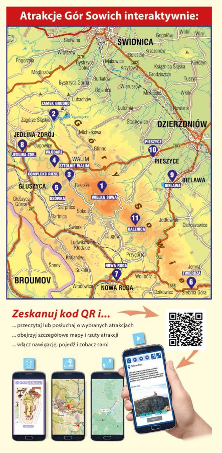 Mapa jest interaktywna, co oznacza, że po zeskanowaniu kodu QR z mapy na swoim telefonie będziemy mieli możliwość zapoznania się z najważniejszymi atrakcjami Gór Sowich w postaci zdjęć planów i dokładnych schematów. Możemy również wysłuchać interesujących opowieści o danym miejscu i znaleźć dogodną trasę dojazdu.