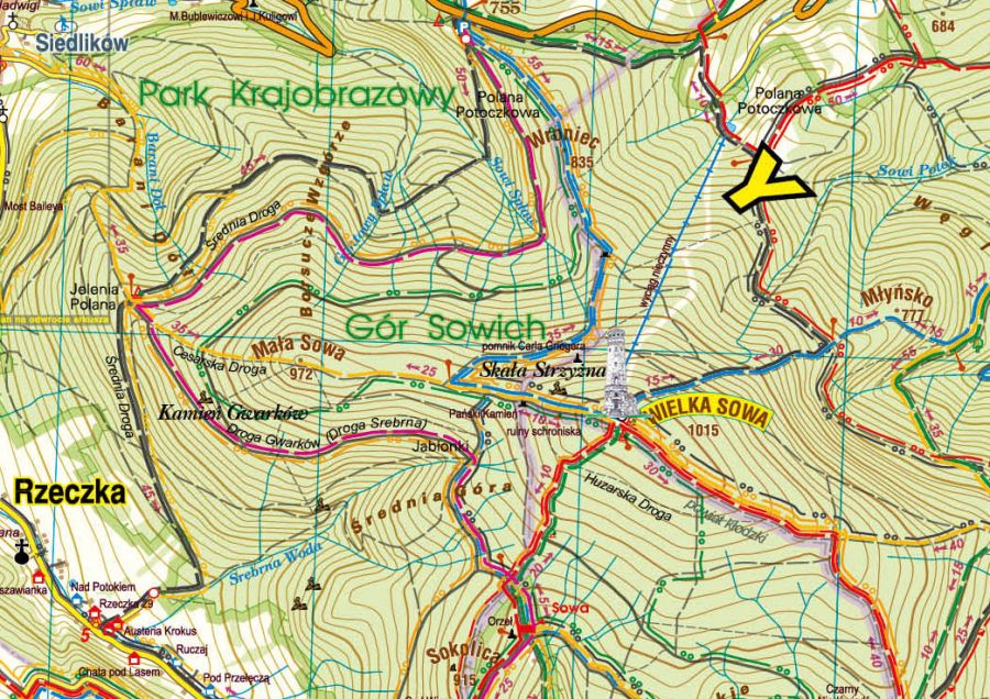 Aktualizowana w terenie mapa turystyczna Gór Sowich. Mapa posiada aktualny schemat szlaków turystycznych pieszych i rowerowych. Dodatkowo rewers mapy zawiera plany miejscowości: Bielawa, Srebrna Góra, Zagórze Śląskie oraz Walim. Na mapie znajdziemy również rozrysowane podziemne miasta kompleksu Riese (Osówka, Walim oraz Włodarz) oraz schemat Zamku Grodno. Oprócz planów na rewersie zamieszczono opis krajoznawczy ze zdjęciami. Mapa posiada siatkę kartograficzną co 1 minutę. Układ współrzędnych (PUWG 1992) oparto na elipsoidzie WGS 84, stosowaną w nawigacji.