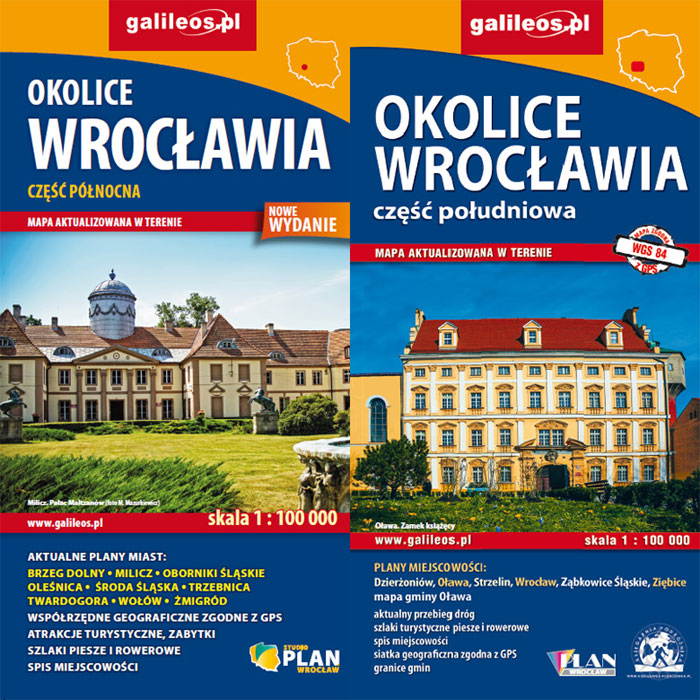 Druga strona mapy części południowej zawiera plany miast: Dzierżoniów, Ząbkowice Śląskie, Ziębice, Oława, Strzelin, Wrocław - szerokie centrum oraz mapę gminy Oława. Na drugiej stronie części północnej znajdują się plany Trzebnicy, Środy Śląskiej, Twardogóry, Milicza, Obornik Śląskich, Brzegu Dolnego, Oleśnicy, Wrocławia - szerokie centrum.