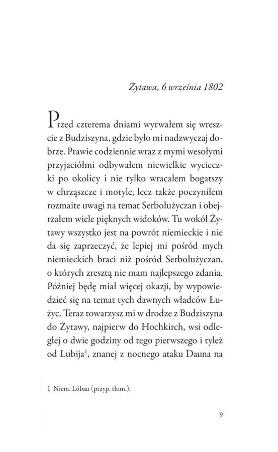 Książka zawiera opis jego pieszej wędrówki odbytej we wrześniu 1802 roku. Jej trasa wiodła przez Herrnhut, Żytawę, Oybin, Frýdlant, Lázně Libverda, Unięcice, Świeradów Zdrój, Szklarską Porębę, Cieplice, Jelenią Górę, Kowary, Gryf i Lubań do Zgorzelca. Znajdziemy tu m.in. szczegółowe sprawozdania z wizyt w osadzie Braci Morawskich w Herrnhut oraz w pałacu znanego naukowca A. Traugotta von Gersdorfa w Unięcicach, relacje z Oybina, Smreka, Chojnika i Śnieżki, a także jedyny znany opis noclegu w legendarnej Michelsbaude przy Starej Drodze Celnej w Wysokim Grzbiecie Gór Izerskich. Lekturę pogłębiają dygresje historyczne, a mnogość szczegółów dotyczących życia codziennego i otoczenia pozwala czytelnikowi przenieść się w czasie i obserwować świat oczami wędrowca sprzed ponad dwustu lat.