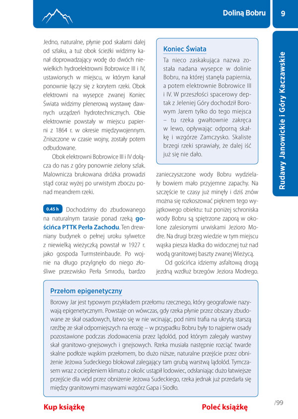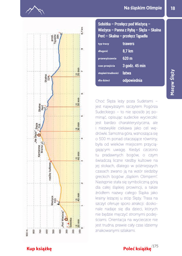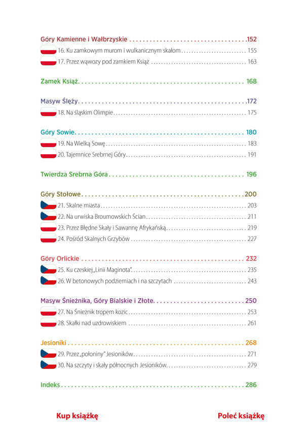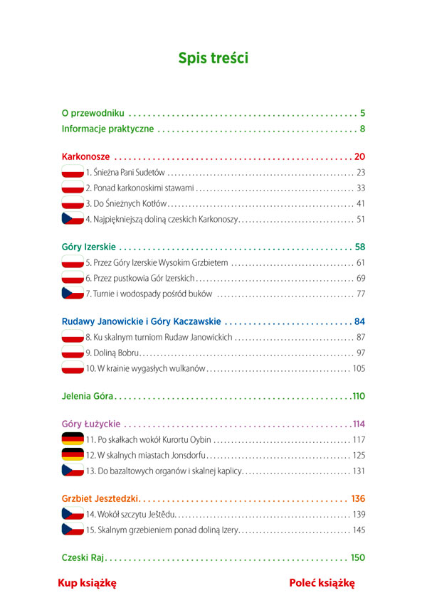 Górska przygoda nie zna granic. W przewodniku opisano 30 wycieczek pośród sudeckich szczytów i dolin zarówno na terytorium Polski, jak i Niemiec oraz Czech. Wszystkie można pokonać w jeden dzień. Przy każdej wycieczce znajduje się mapa pokazująca przebieg trasy, profil wysokościowy, a także informacje o tym, czy jest ona odpowiednia dla dzieci. W wycieczkach, które dają taką możliwość, zamieszczono krótkie notatki o sposobie pokonania danej trasy na nartach albo na rowerze górskim.